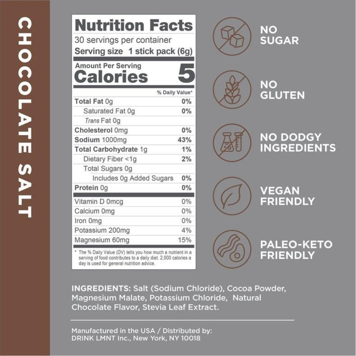 Chocolate Salt: Salt (Sodium Chloride), Cocoa Powder, Magnesium Malate, Potassium Chloride, Natural Chocolate Flavor, Stevia Leaf Extract.