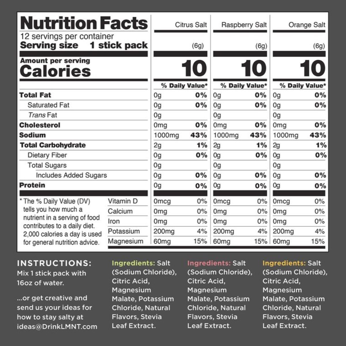 You can find a full list of ingredients and nutrition facts panels for every flavor of LMNT by visiting our webstore and scrolling through the product images.