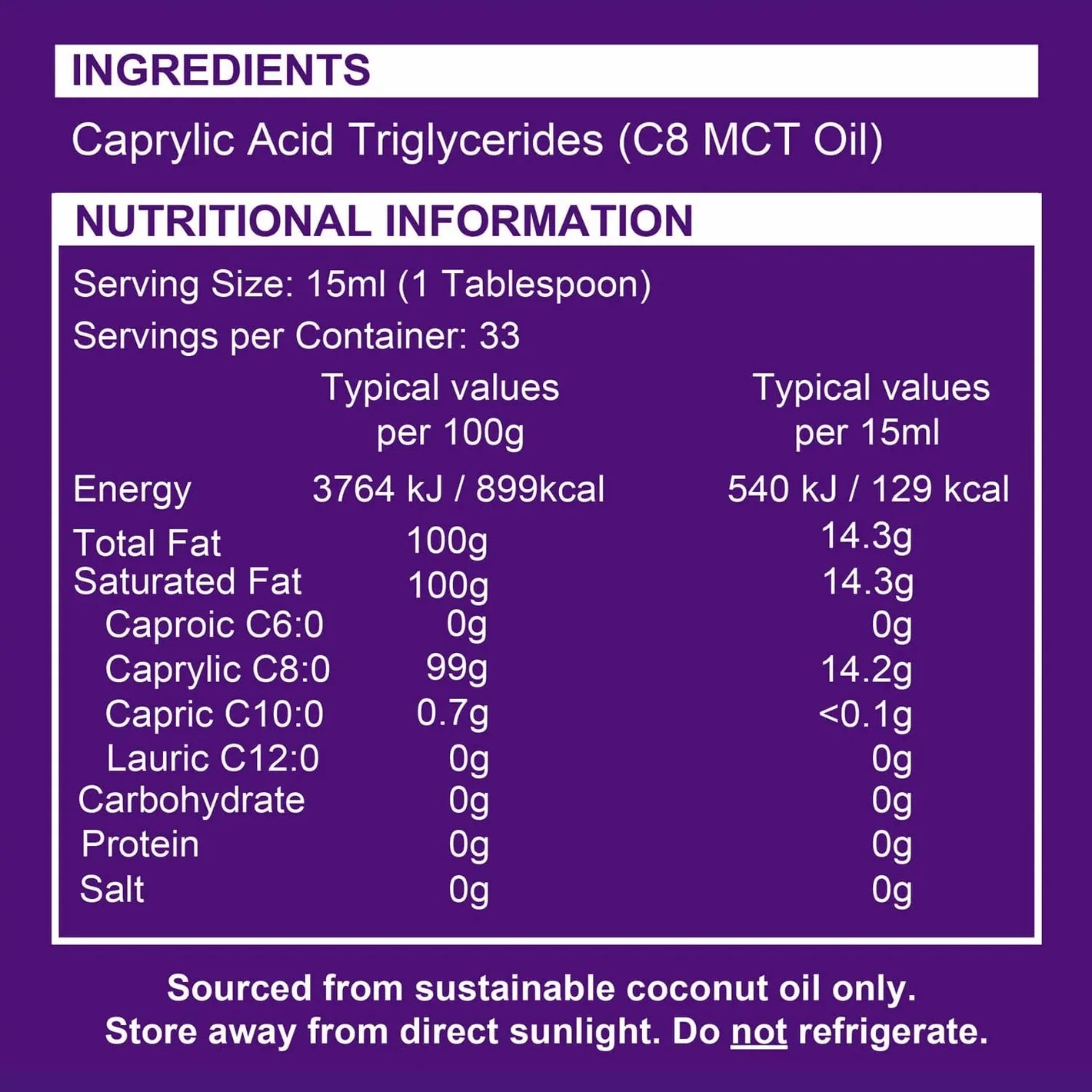 Ketosource Pure C8 MCT oil is a pure Caprylic Acid Triglycerides (also known as C8) product.See this in-depth article on Caprylic Acid (C8) to understand the research and how it works.